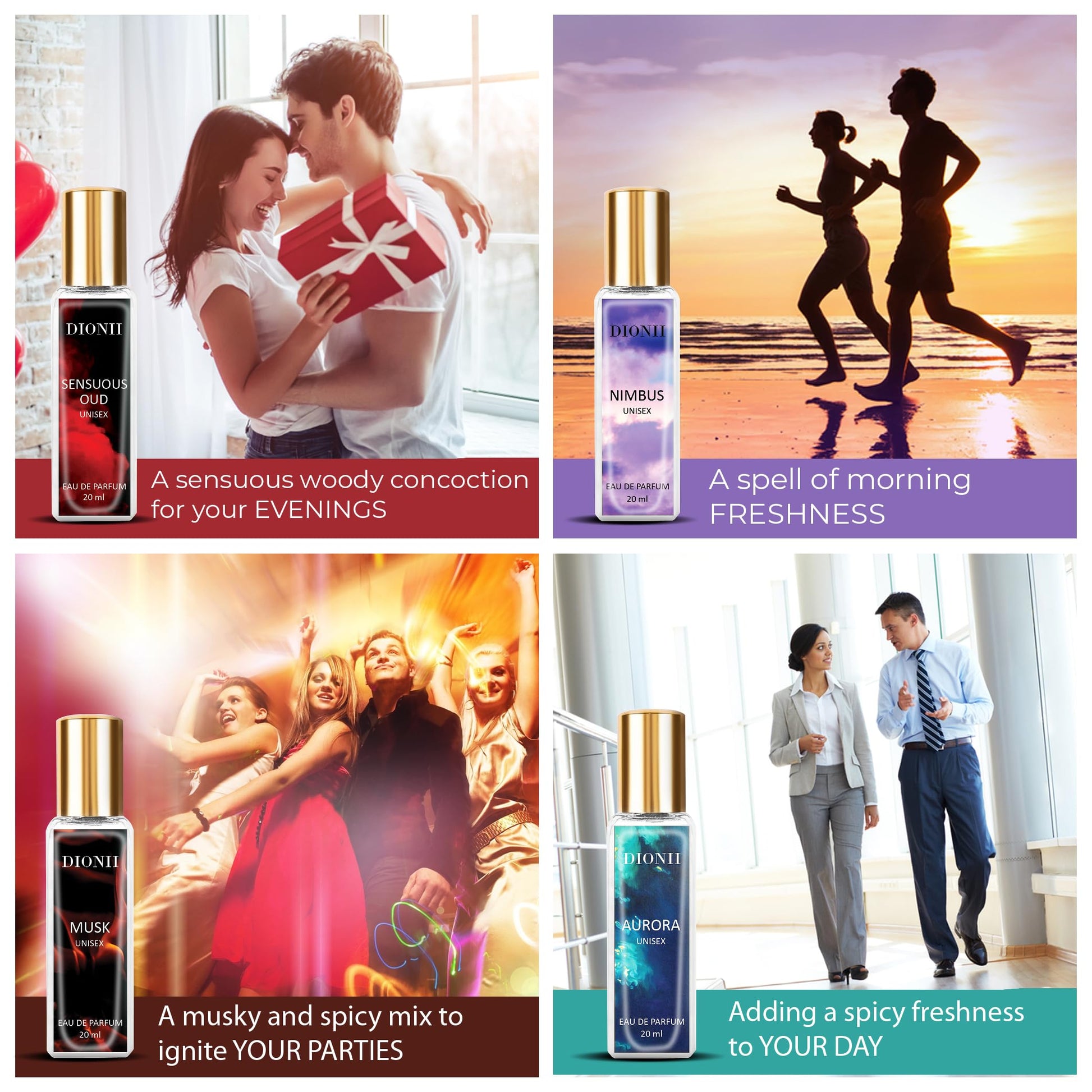 Dionii Eau De Parfum Rakhi Gift Set for Unisex | MUSK, AURORA, SENSUOUS OUD, NIMBUS Perfume | Long Lasting Fragrance (4 x 20ml Each)